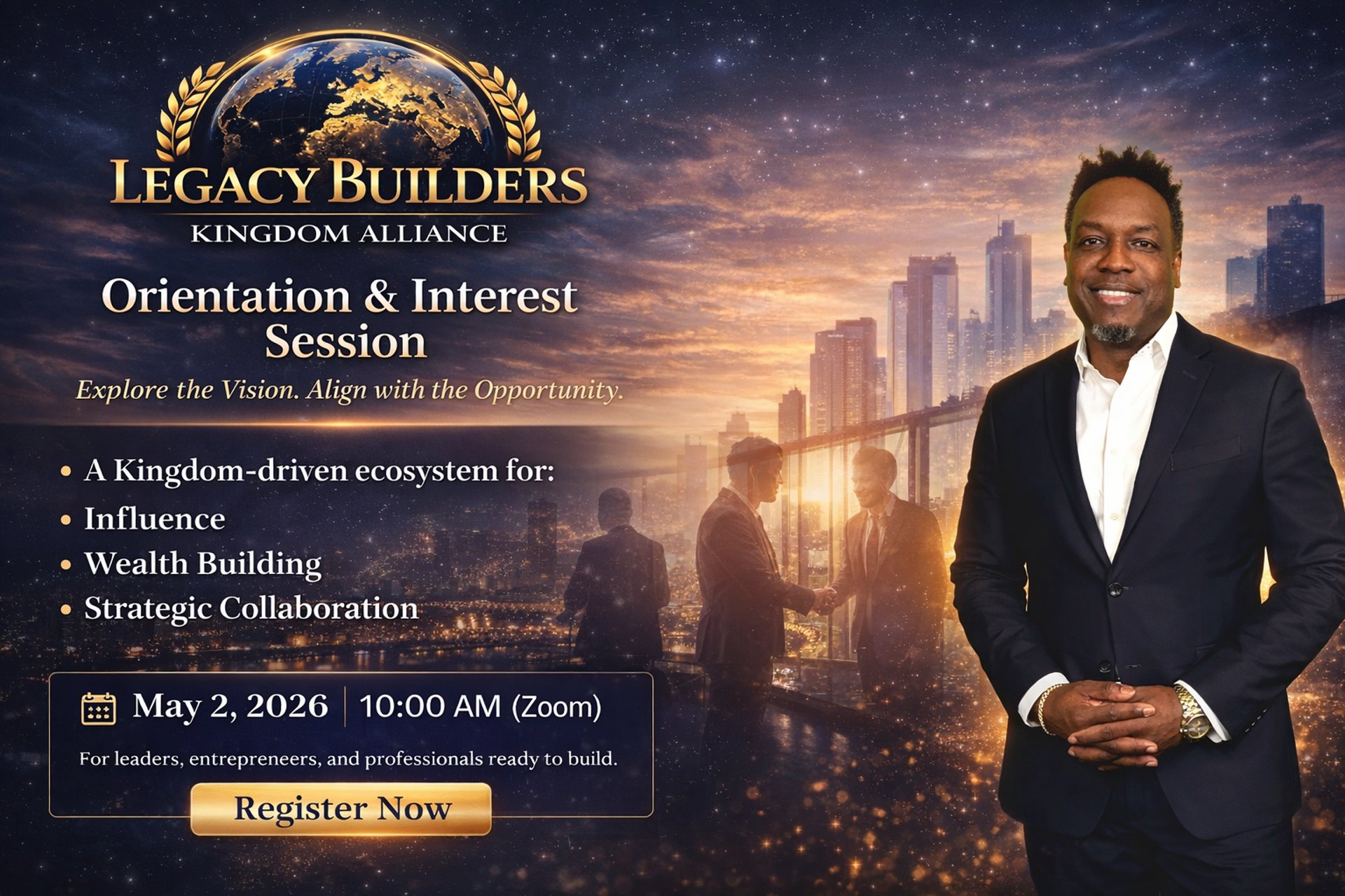 The Legacy Builders Kingdom Alliance exists as a Kingdom chamber for influence, wealth, and generational impact. This Orientation is designed to introduce the vision, structure, and opportunities available to those who sense they are called to build in this season.